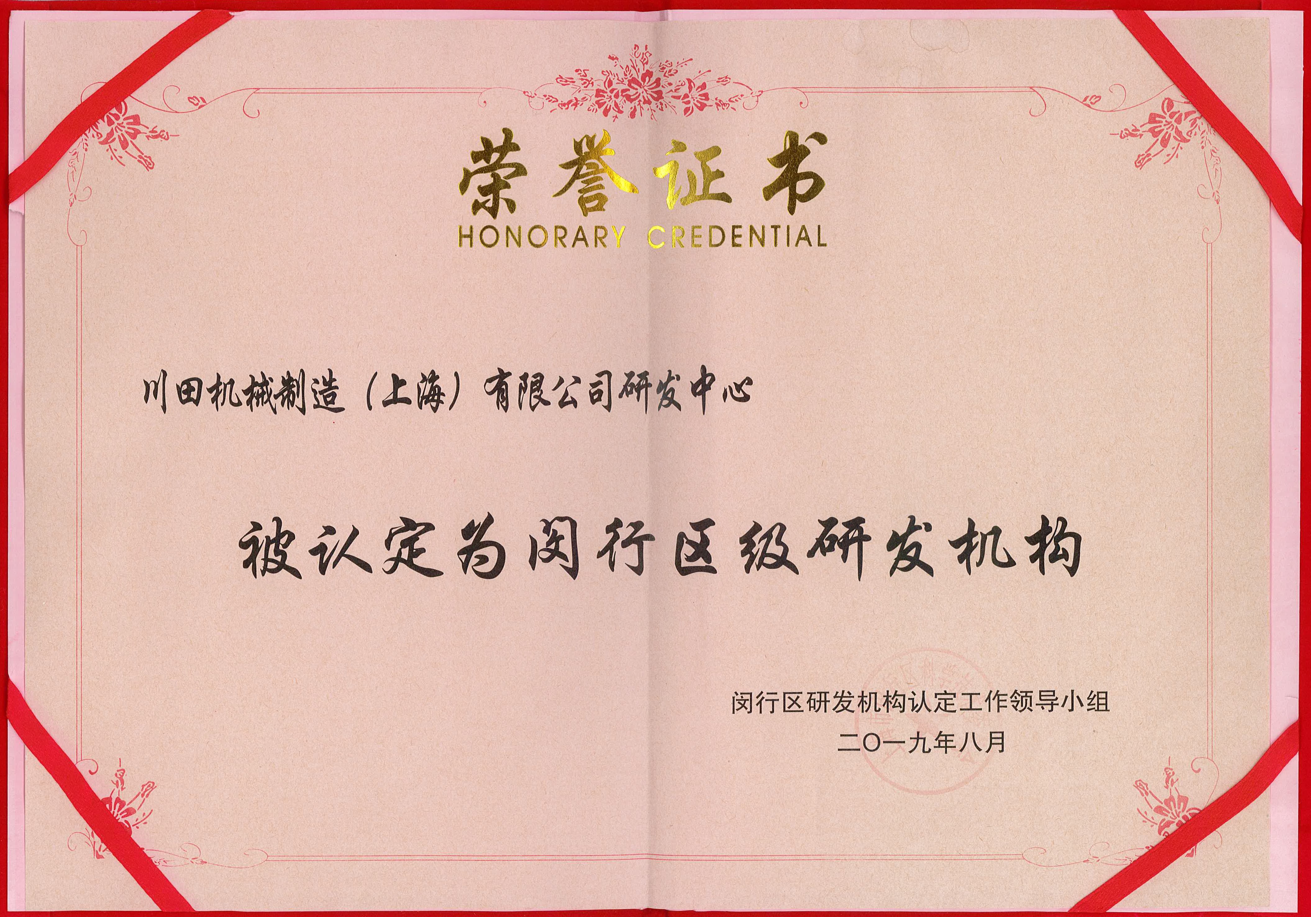 2019 閔行區(qū) 研發(fā)機(jī)構(gòu)證書